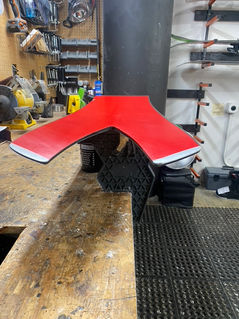 Here is one with a missing section of sidewall. It was not impact related. It just had a bad lamination and the chunk popped out while riding. The first step was to clean the area out and remove the old epoxy and any debris in the area. Next, the core was leveled out to a uniform depth. From there, a new chunk of sidewall was prepped and shaped to the correct size. After that chunk was laminated and set, the excess material was filed down flush to the existing sidewall. The board was also stone tuned for racing.