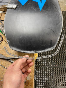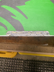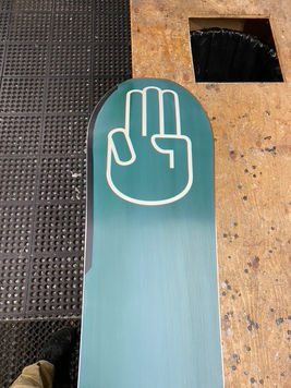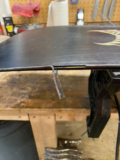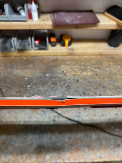 This board had a smashed in edge, along with base damage. A new piece of edge was transplanted and cut with a wedge pattern to lock into the existing material. The damaged base material was removed and a new piece was templated in that same shape and epoxied in. The edge was then filed flush and full tuned from there.