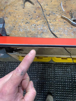 This board came in with the edge already missing around the entire perimeter of the nose. First step was to cut back the ends of the existing edge back to a point where they were straight and bonded well. Next step was to take a new piece of edge and bend it to match the curvature of the board. That new edge was laminated in place and the board was hand sanded in that area before doing a full tune.